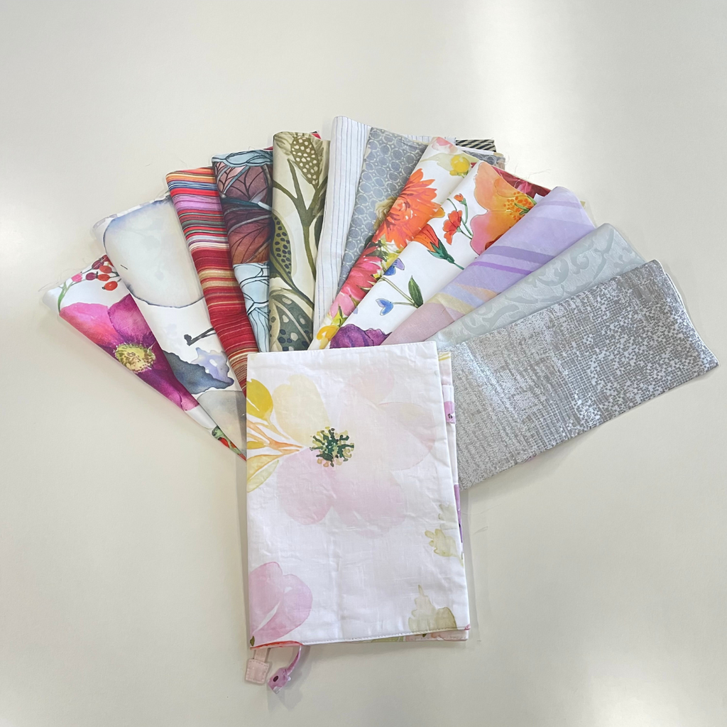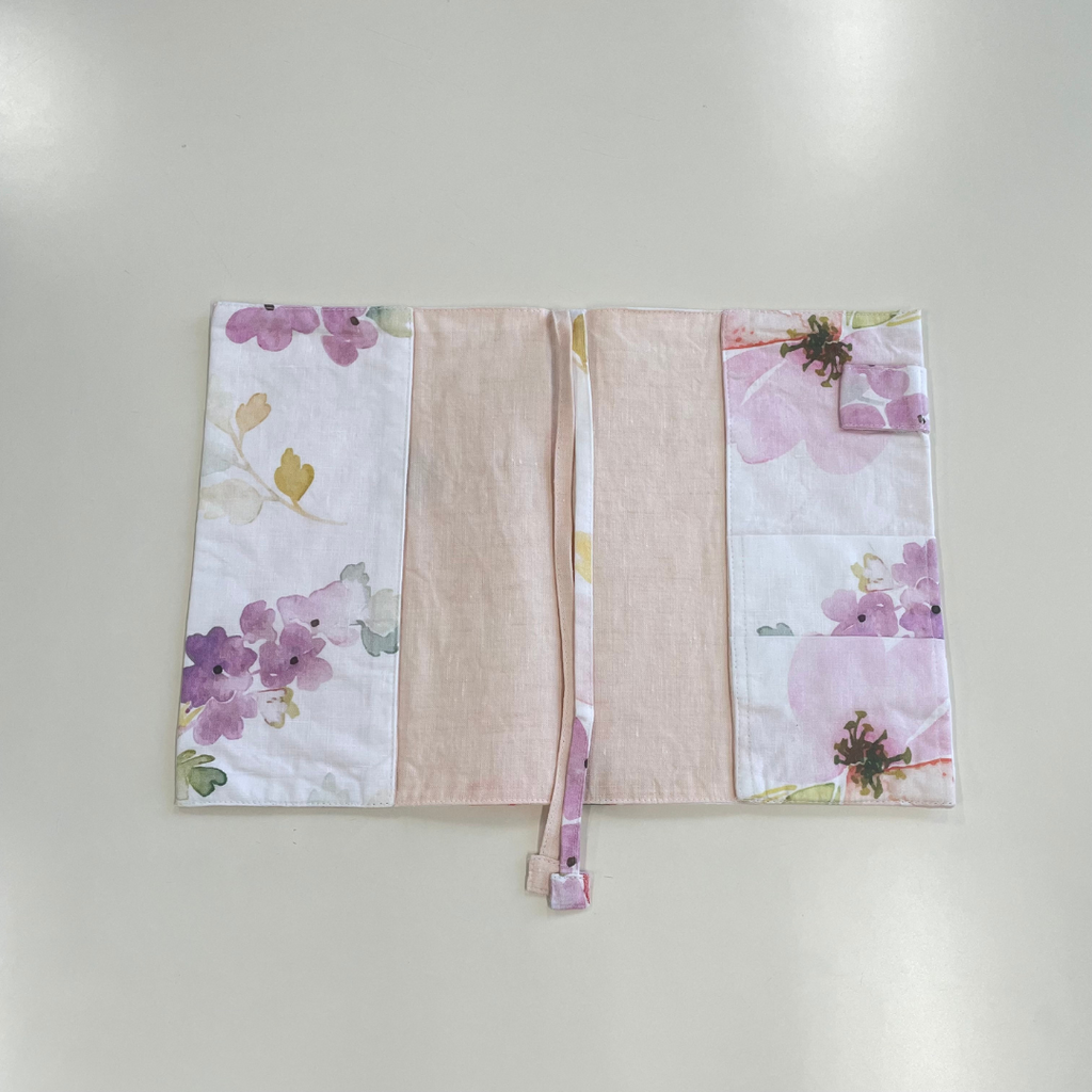 SDGsの観点から、寝具カバーを作る工程で出た端切れ生地を手帖カバーにアップサイクルいたしました。